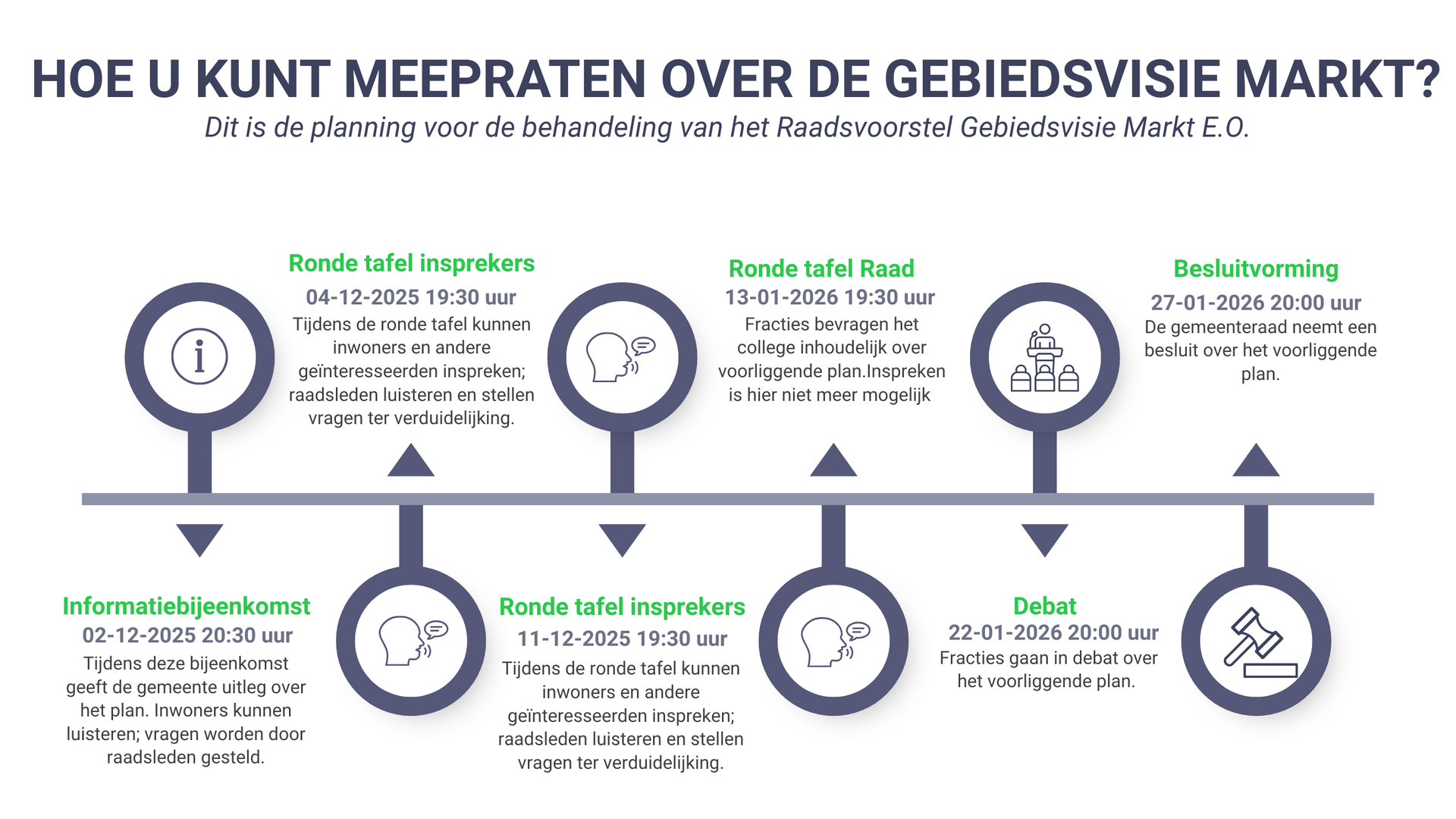 De agendacommissie van de gemeenteraad heeft inmiddels het proces vastgesteld voor de behandeling van de Gebiedsvisie Markt. De komende tijd zijn er verschillende momenten waarop jij kunt meekijken, meeluisteren of jouw mening kunt laten horen.